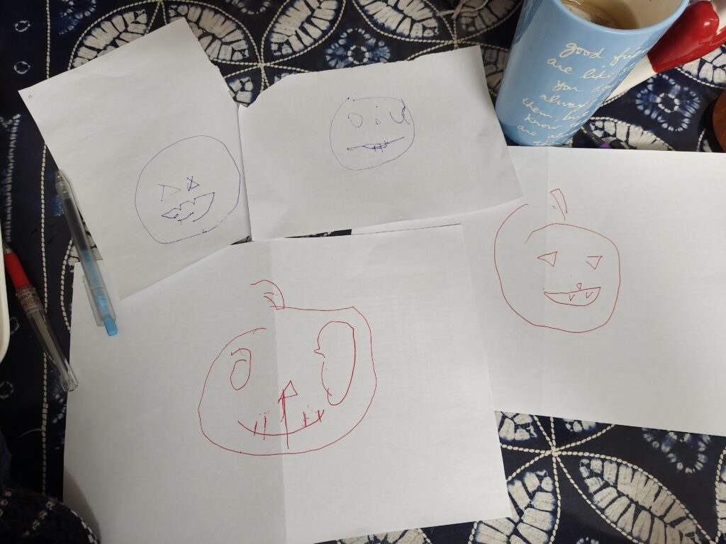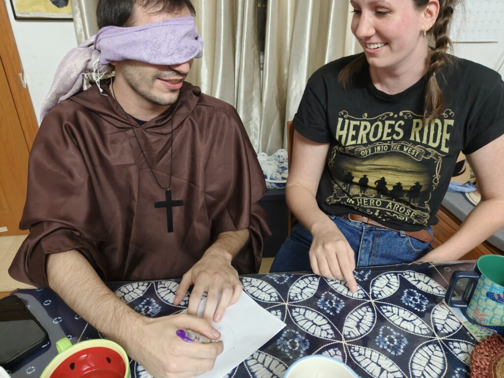 So for the first game, we worked in pairs. One person had to blindfold themselves and the other person looked at a picture of a pumpkin and then had to describe it to their partner while their blindfolded partner drew it. We laughed a lot and drew some pretty weird pumpkins (that were better than I expected!) and might have learned a bit about communication strategies, hahaha.