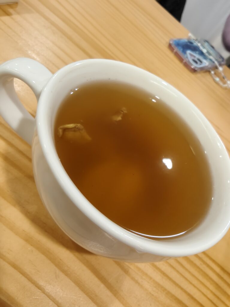 Jessica and Elizabeth were feeling a bit annoyed since they had already been in the café for a while, but when the staff brought out complimentary drinks, we felt that helped to smooth things over. Since I wanted to avoid caffeine, I ordered a honey ginger tea. It was perfect for a cold day, and they put lots of ginger in it, so it was very spicy! They gave me a refill of hot water, and that was perfect.