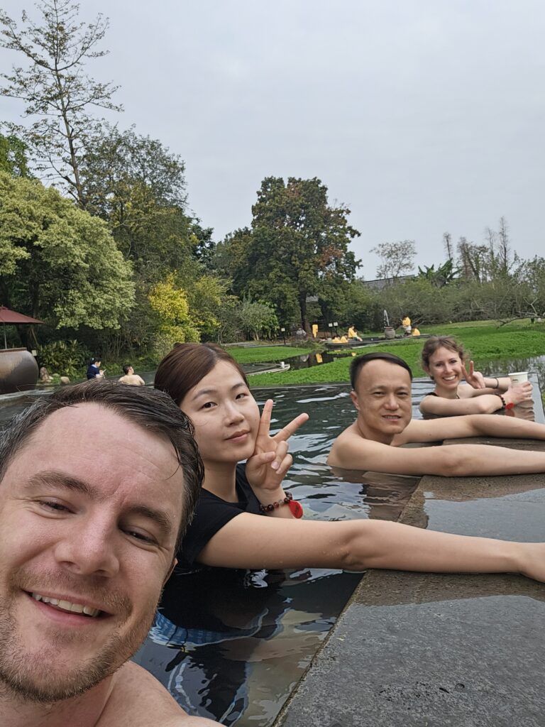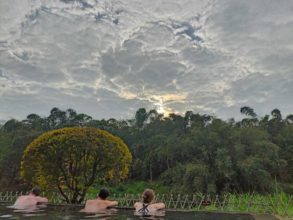 We went to 禅泉度假酒店 (chan quan dujia jiudian) just for the hot springs, and it was wonderful! They had lots pools with different temperatures ranging from 38-43 degrees Celsius (100-109 degrees Fahrenheit). The pool where we spent the most time was next to the edge of the hot springs area, and we could look out over the sunset and the trees. It was a beautiful place to enjoy a soak.