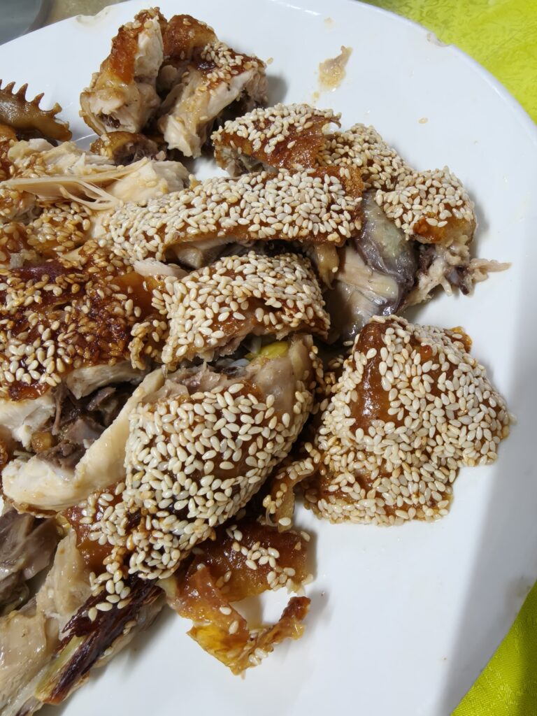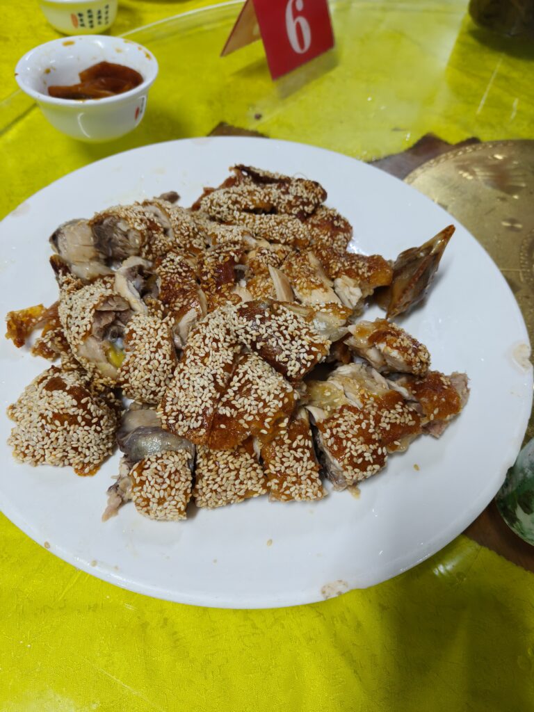 The restaurant also had some great tofu and a nice green vegetable and pretty good rice cooked in a pot with eel (煲仔饭, baozaifan with 鳗鱼, manyu; or 鳝鱼, shanyu—I can’t remember which word they used). But we all agreed that the sesame chicken (芝麻鸡, zhima ji) was absolutely the best. Even thinking about it now makes me feel hungry.