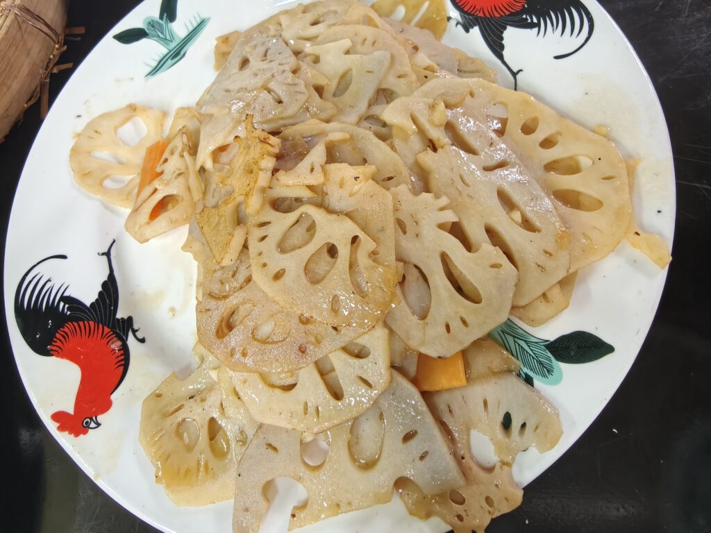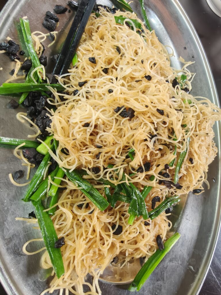 1. Lunch. We went to a delightful little place in the village for lunch and had some local foods. Some of the local specialties include a thin taro pancake—savory (芋头糕, yu tou gao), black olive fried rice noodles—one of my favorite dishes from lunch (榄角炒米粉, lanjiao chaomifen), half of a soy sauce chicken (豉油鸡半只, chiyouji banzhi), pan-fried and baked tilapia (煎焗罗非鱼, jian ju luofeiyu), stir-fried snail (炒山坑螺, chao shan keng luo), and oyster sauce lotus root slices (耗油藕片, haoyou ou pian).