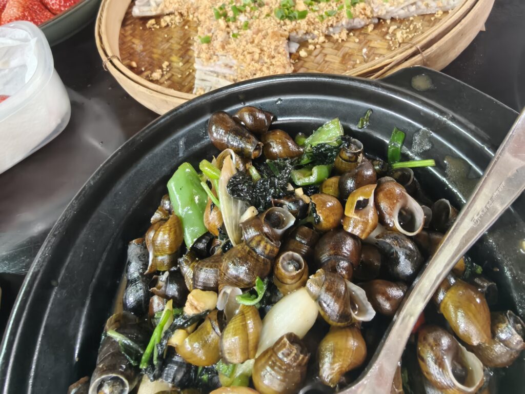 I’m not sure about all of those translations, but it’s the best I can do! Snail is a common local food for many of the villages in Guangdong. They’re pretty tasty, but I wouldn’t order them unless there’s someone who really likes them because they’re a lot of work to eat, so I usually give up after eating a few. But the flavor is nice, and when the meat comes out easily, they’re great!