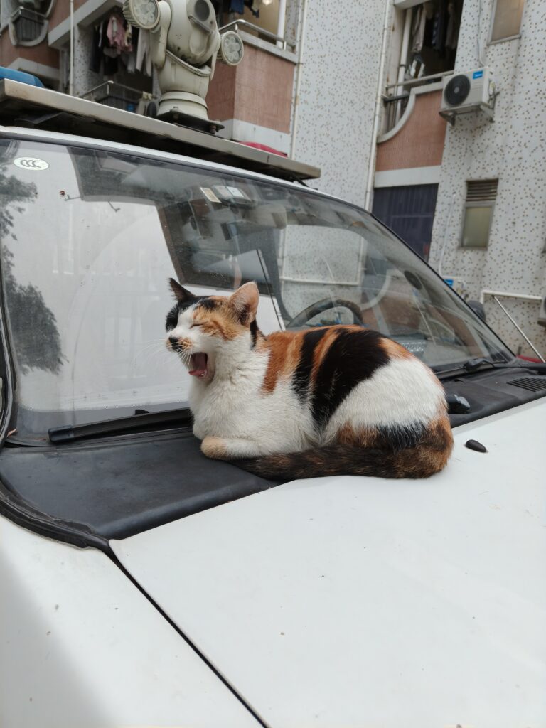The other day, Kendra and I were walking on the road by the students’ dorms. There are lots of kitties in that area (the students often feed the cats. I think there is even a club called the Love Cats Club who take it upon themselves to care for the cats). We saw a truck parked by the road and a kitty was sitting on the hood of the truck. It was so cute so Kendra and I went over to say hello.