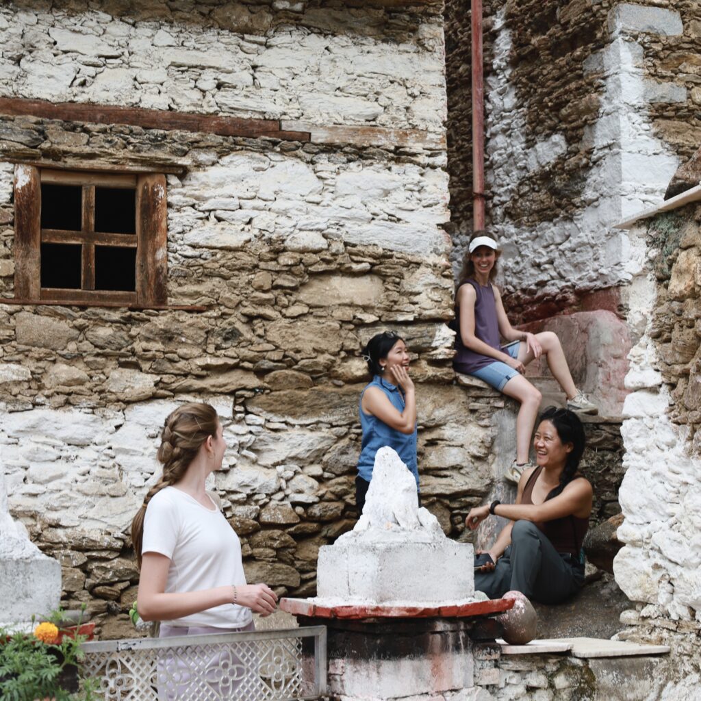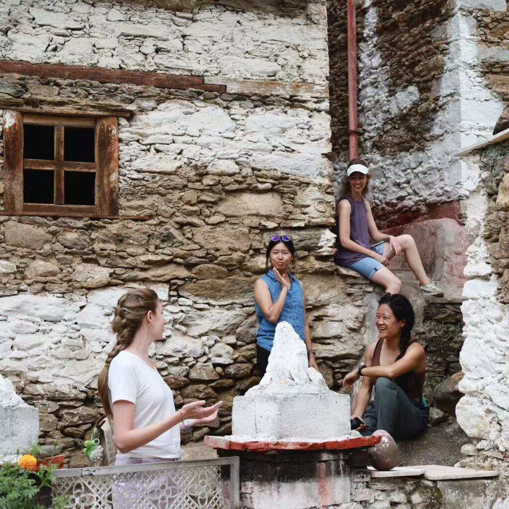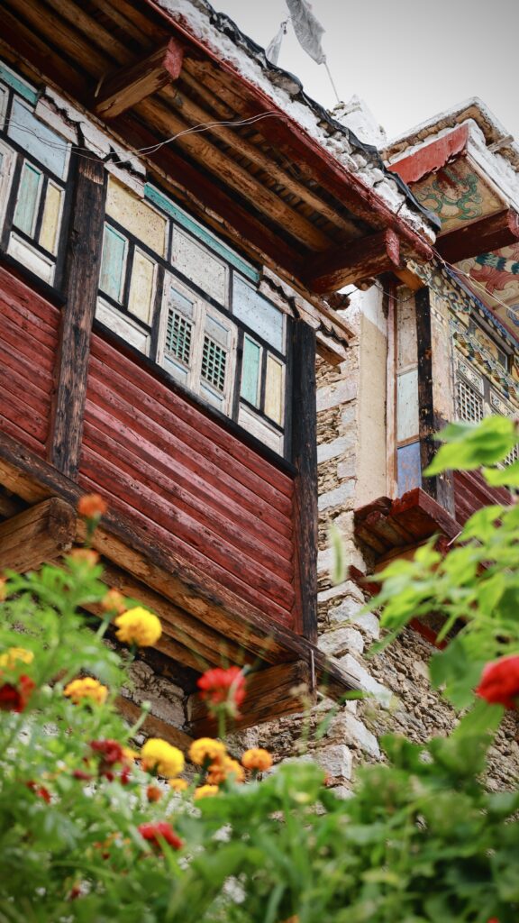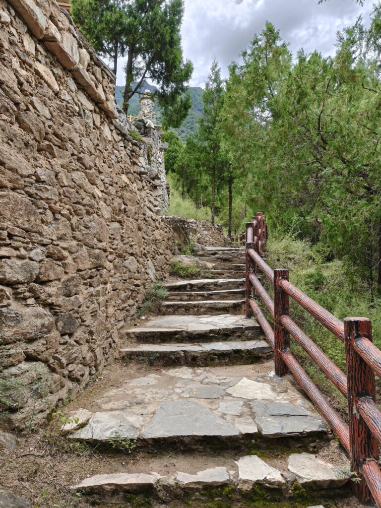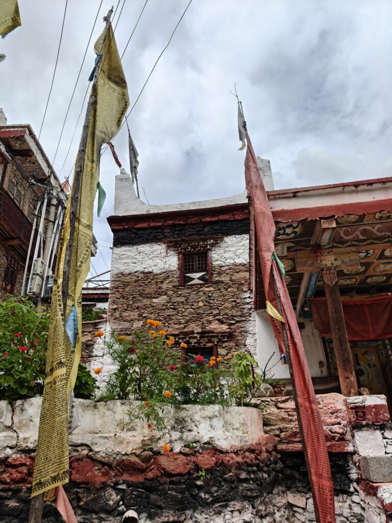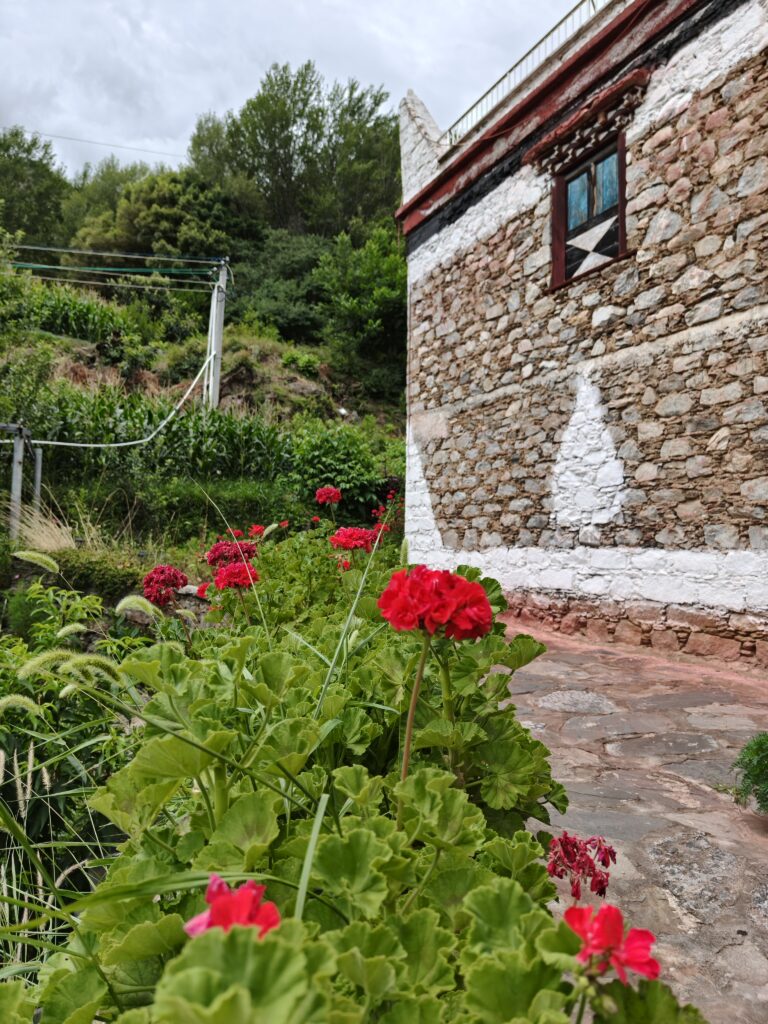 The view of the mountains and the valley and the buildings dotting the side of the mountain with their unique white, black, and red towers was beautiful. A few locals were selling dried flowers for tea and some other local products.