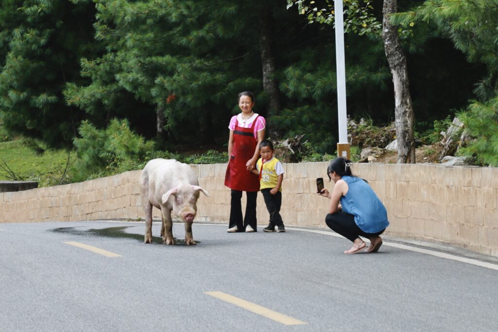 Just before we arrived at the lookout point, we passed a lady and her son who were walking a pig up the mountain. Since we often saw animals on the road, it wasn’t that unusual, but it was still interesting. When we got to the viewpoint, the first thing Jaye did was to walk back to take a picture of the pig. She asked the lady first who didn’t mind.