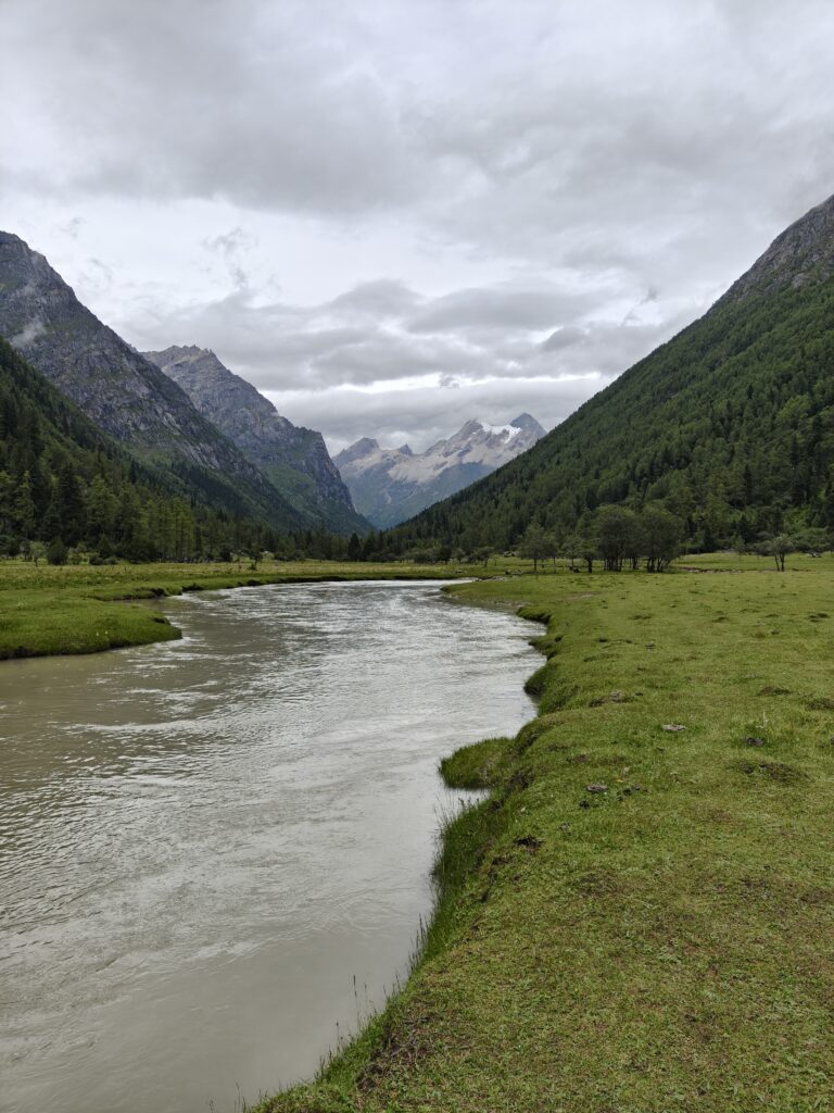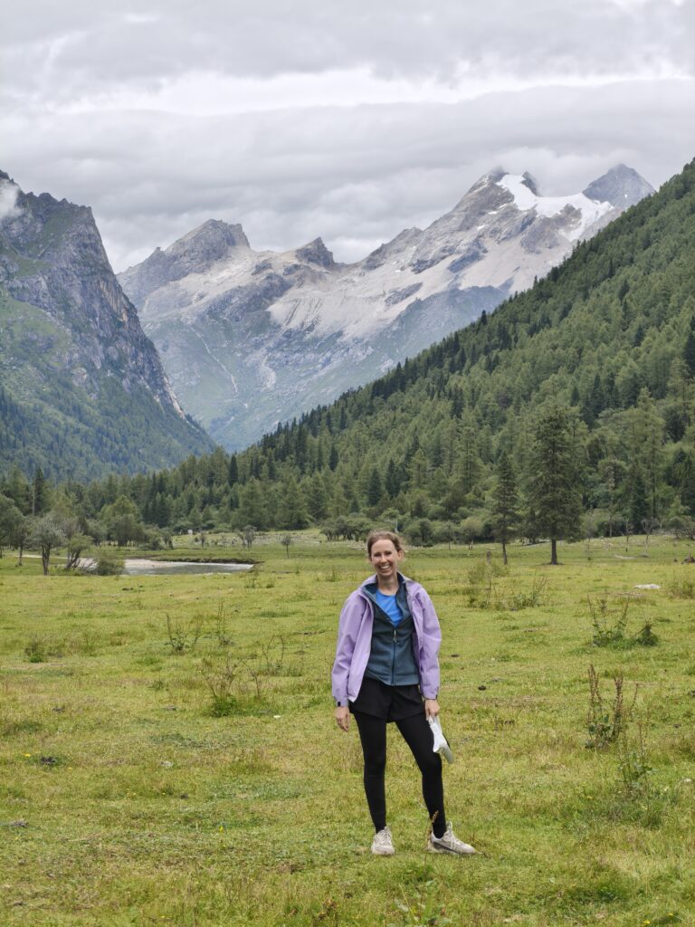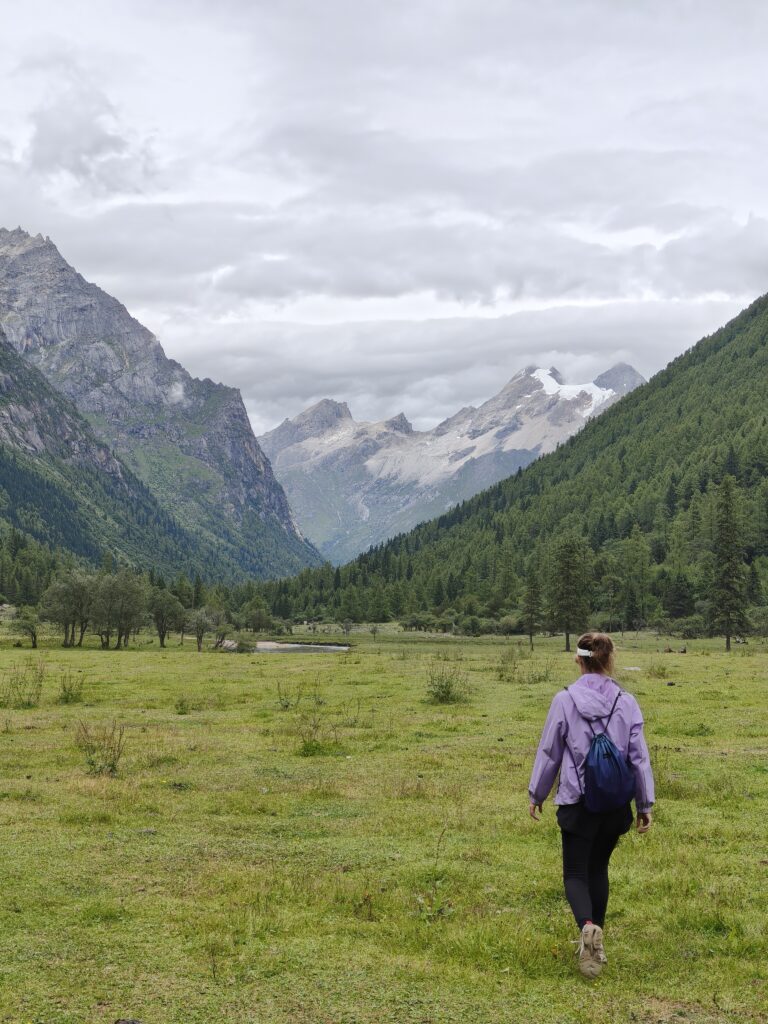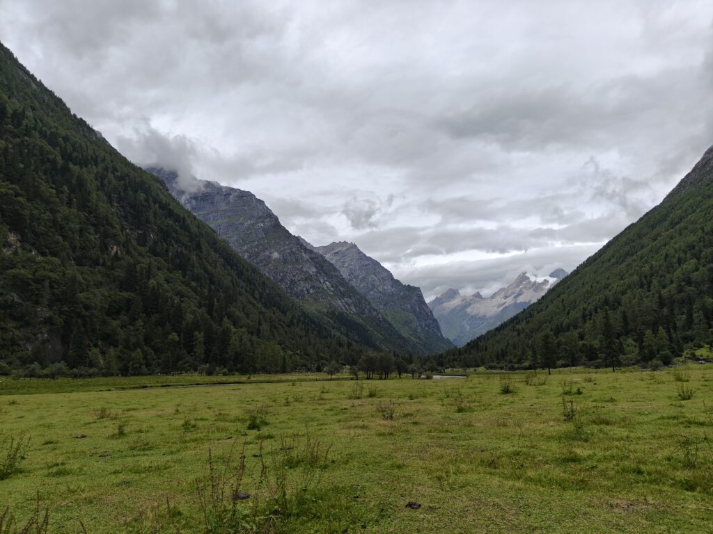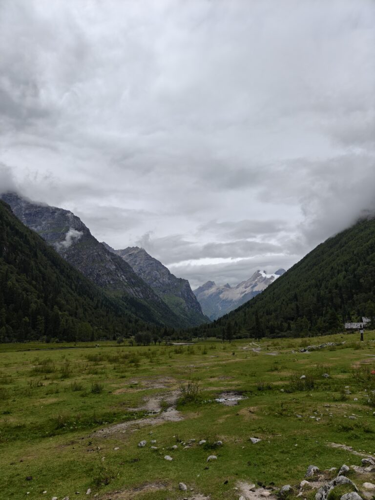 As we got closer and closer, the trail started to go up again. We had been walking on a flat trail for so long that I had forgotten how high we were. I think it was somewhere around 3,000 meters. Since we had been at higher altitudes for around a week now, walking on flat ground was ok, but when we started to go up again, I started to feel the altitude. I slowed down and plodded forward. Thankfully, we didn’t have too far to go on the uphill stretch before we got to the top of a ridge and looked out into a beautiful meadow surrounded by mountains. By now, the low-hanging clouds had fully cleared and we had an incredible view of the mountains in the distance.