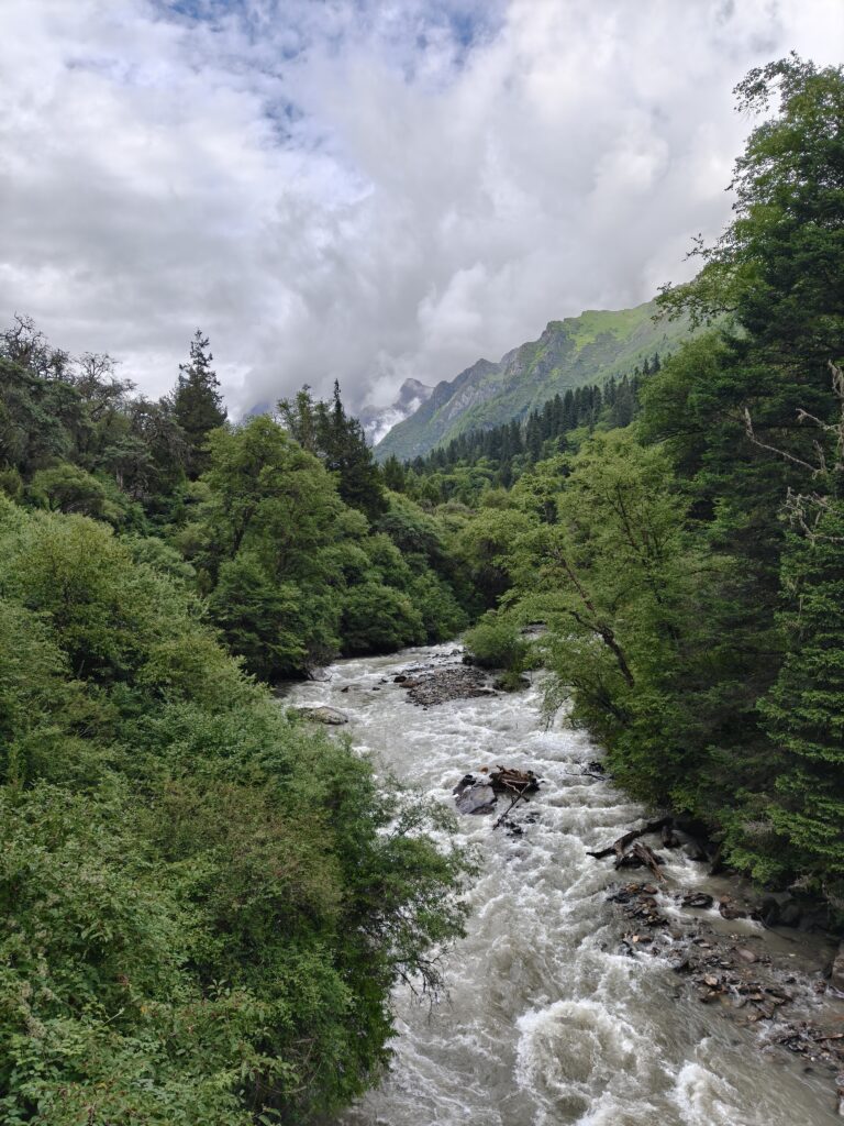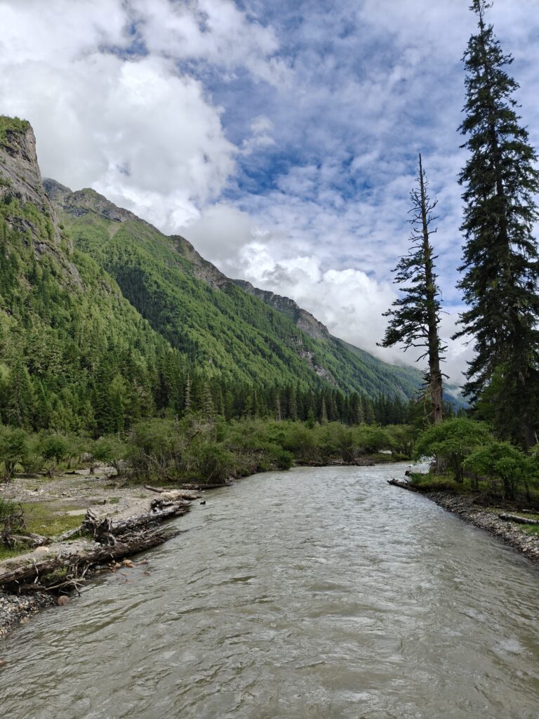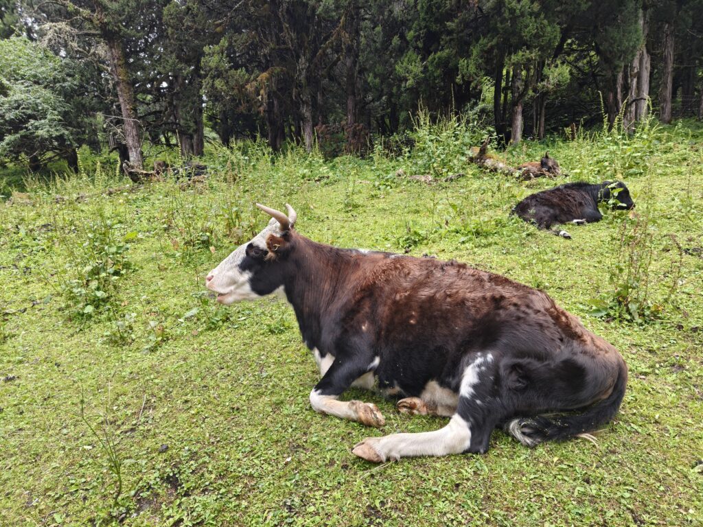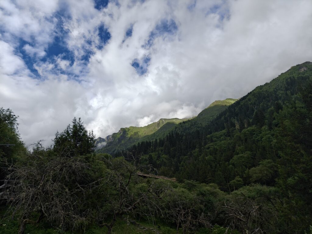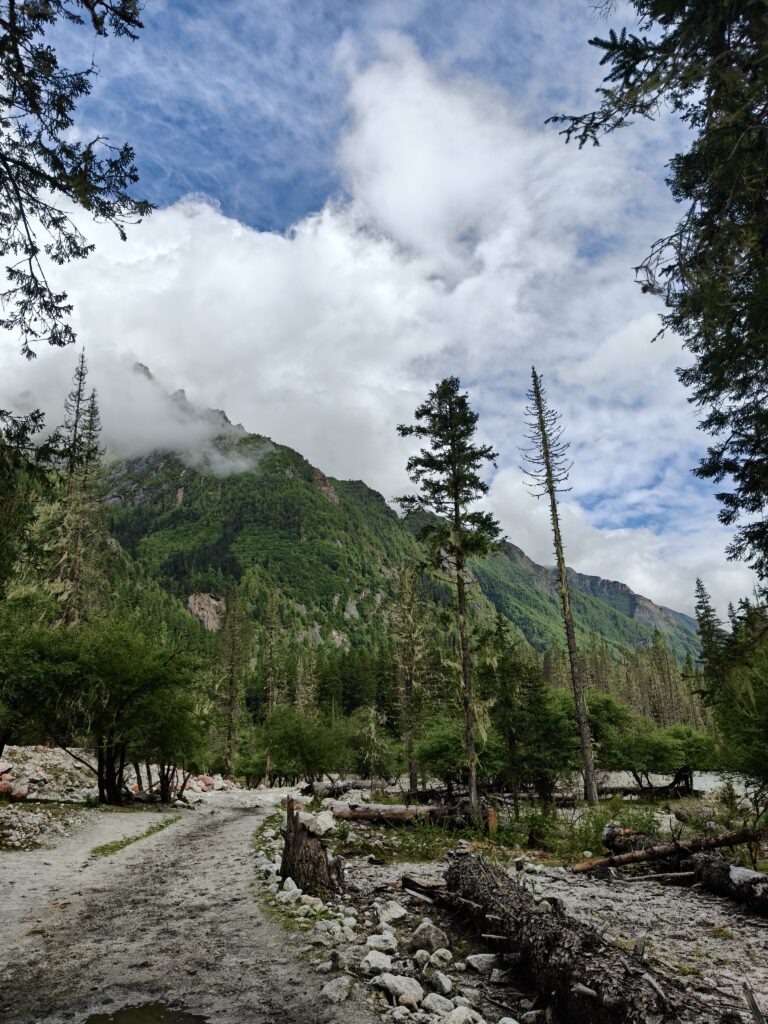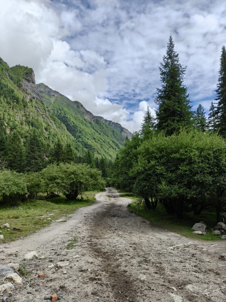As we got closer and closer, the trail started to go up again. We had been walking on a flat trail for so long that I had forgotten how high we were. I think it was somewhere around 3,000 meters. Since we had been at higher altitudes for around a week now, walking on flat ground was ok, but when we started to go up again, I started to feel the altitude. I slowed down and plodded forward. Thankfully, we didn’t have too far to go on the uphill stretch before we got to the top of a ridge and looked out into a beautiful meadow surrounded by mountains. By now, the low-hanging clouds had fully cleared and we had an incredible view of the mountains in the distance.