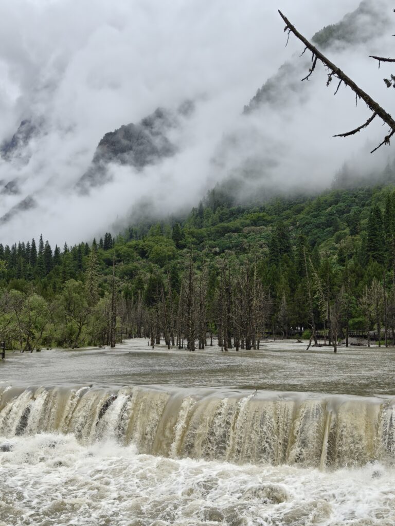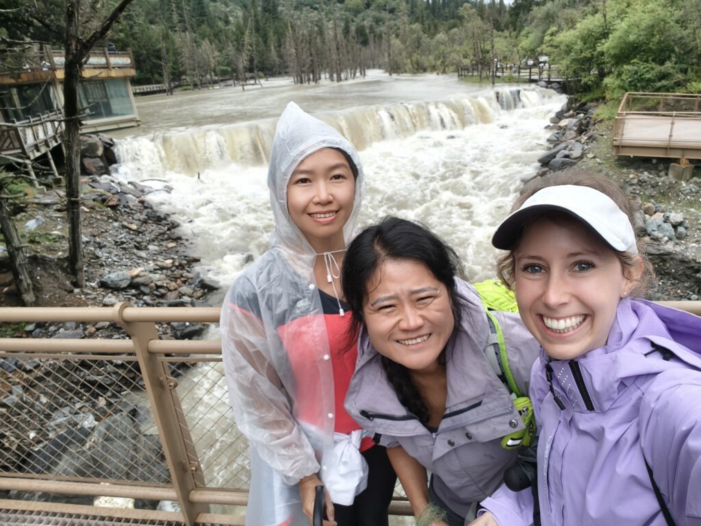 We got to one of the first scenic spots around lunch time. The sky was still dripping a bit, but we took our pictures of the beautiful waterfall with some bits of mountain visible through the fog in the background. The river was quite full—I think it must have been the rainy season, and it was nice to enjoy the beauty of the small waterfall.