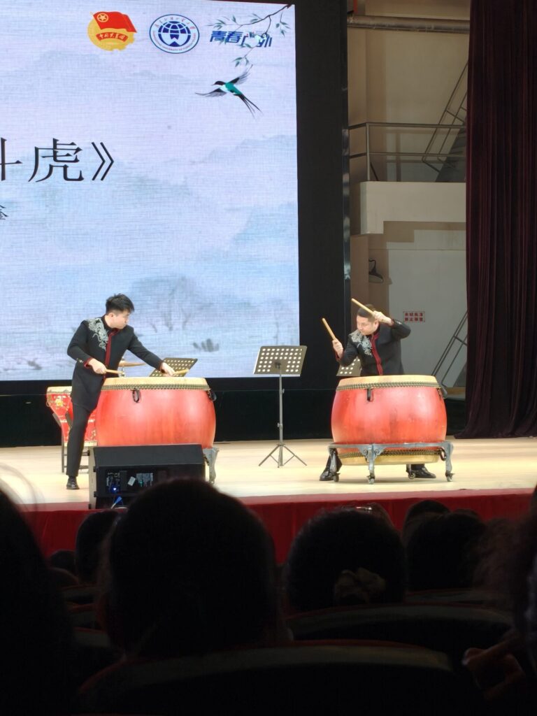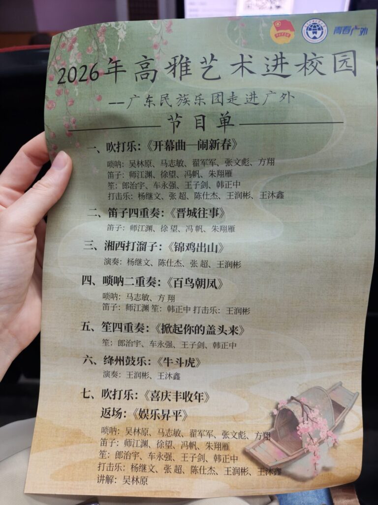 I looked at the program and saw there was one instrument that I recognized, the 唢呐 (suo na) which is a trumpet-like instrument with a very piercing sound. It wasn’t my favorite instrument, but I was still excited about the performance. After the performance, my opinion of this instrument is completely different. I loved it!