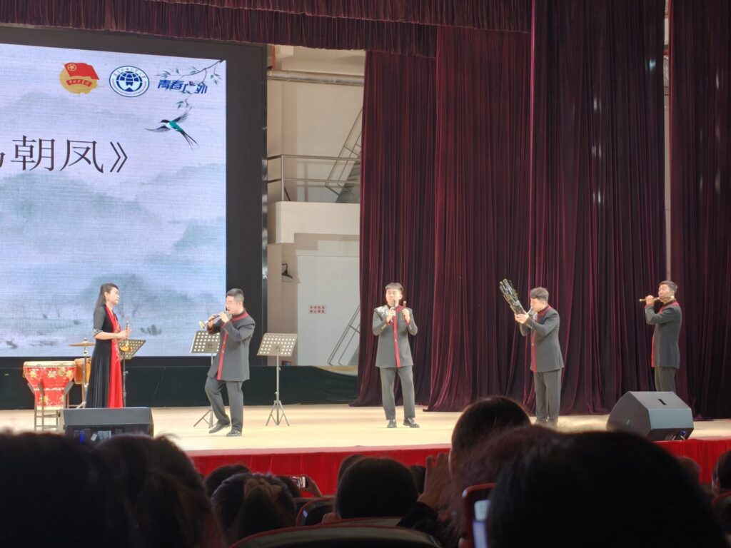 This video is from the second song. I forgot to film the first song, because I was too excited. As you can see, this is a bamboo flute (笛子, dizi) quartet called, 《晋城往事》(Jincheng wang shi; Jincheng is a city in Shanxi Province, and wang shi means the past events). The song seems a bit melancholy to me. I also think it’s interesting that the bamboo flutes are different sizes, creating sounds.